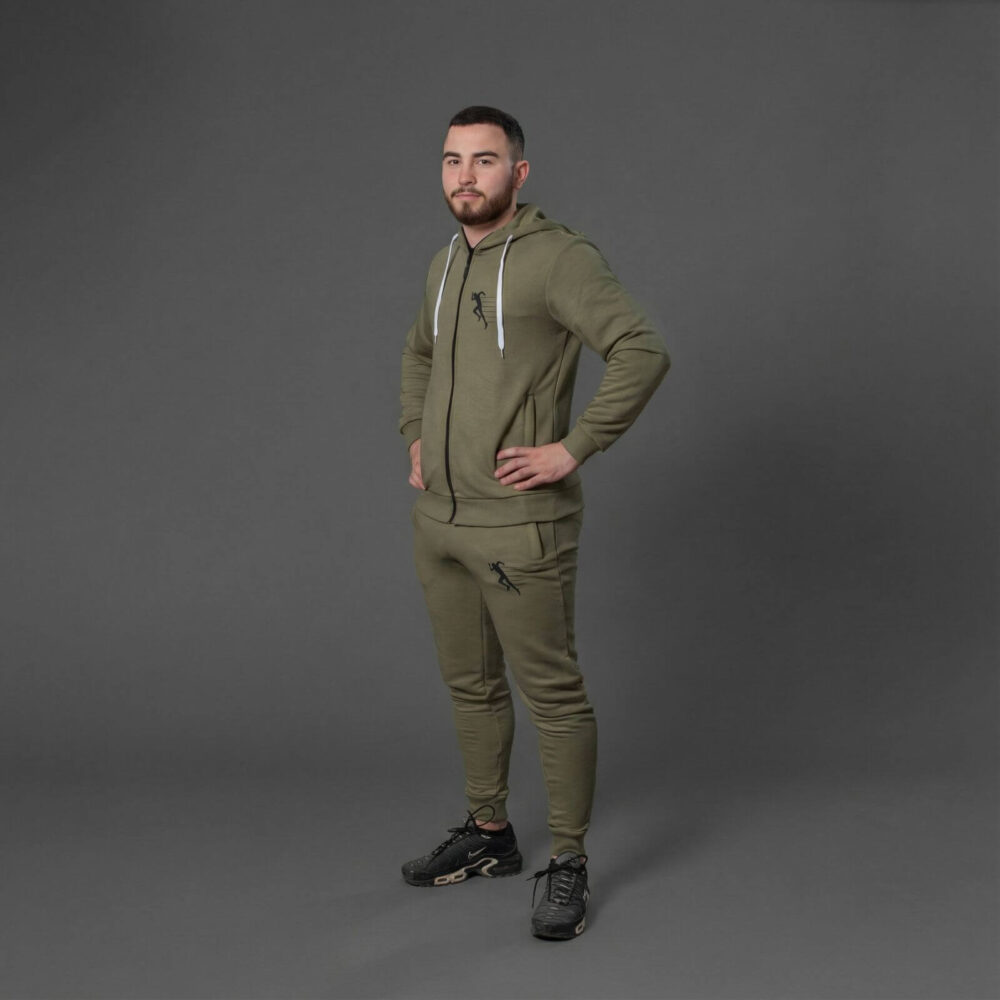 Mekana i udobna muška maslinasta pamučna trenerka (80% pamuk, 20% poliester). Topla, postojana i prijatna za nošenje. Idealna za svaki dan i moderan casual stil.