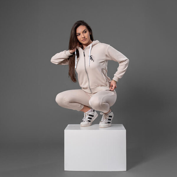 Mekana i udobna ženska svetlo krem pamučna trenerka (80% pamuk, 20% poliester). Lagana, prijatna i elegantna, savršena za svakodnevno nošenje. Kombinuje prirodnu udobnost, jednostavnost i moderan casual stil.